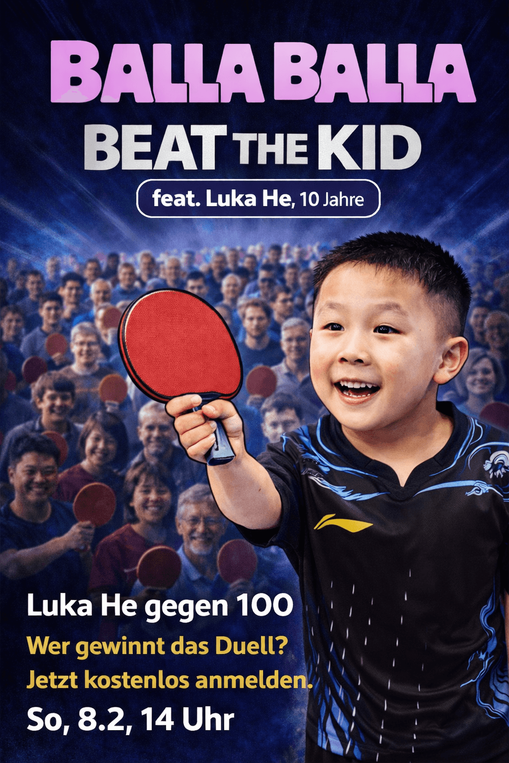Wie gut bist du wirklich an der Platte? Bei BEAT THE KID tritt Tischtennis-Ausnahmetalent Luka He (10 Jahre) gegen 100 Amateure an – und jede*r hat eine Chance!
