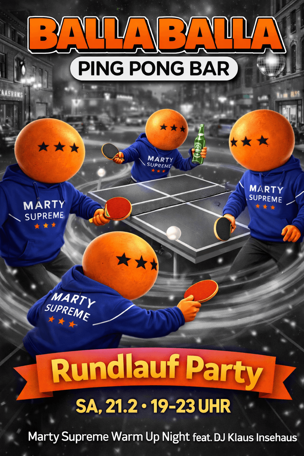 Ping Pong, Party, Popkultur. Bevor „Marty Supreme“ ab 26. Februar bundesweit ins Kino kommt, feiern wir bei BALLA BALLA schon mal standesgemäß vor – mit einer Rundlauf-Party im 50s-Vibe.